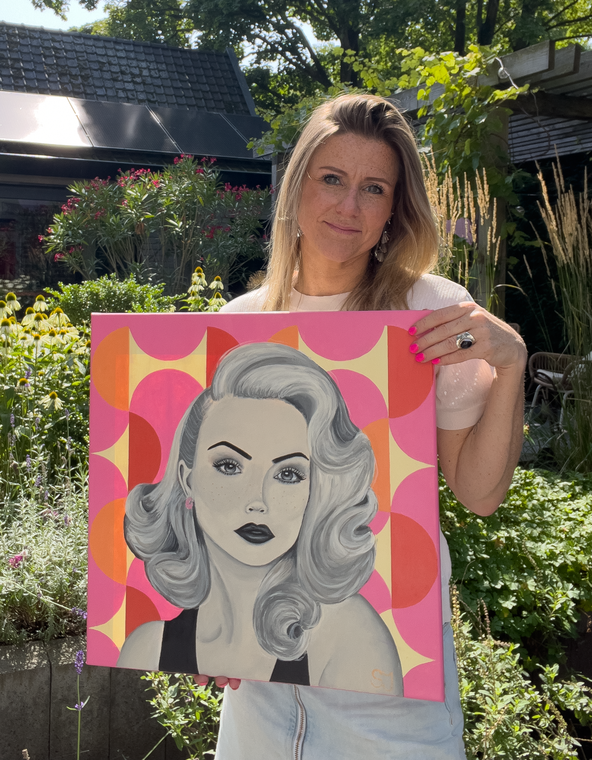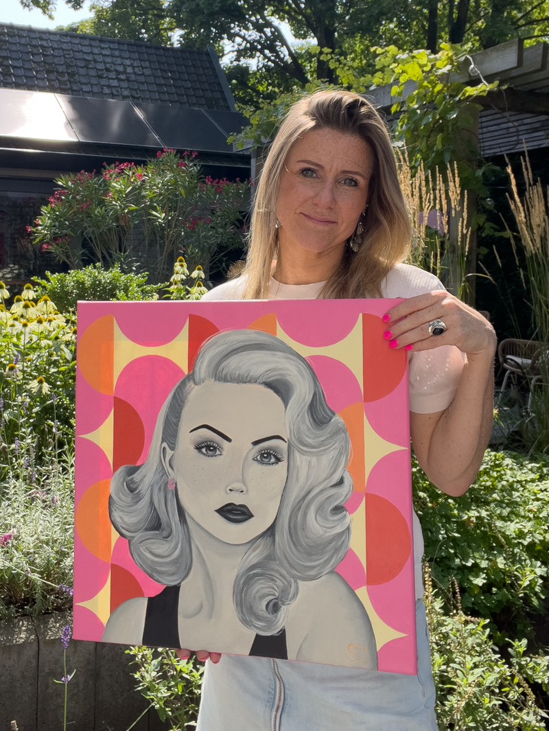 Mijn stijl draait om contrast: zwart-wit portretten met retro kleuren, krachtige lijnen en een zachte uitstraling. Ik schilder vooral vrouwen als sterke en eigenzinnige figuren. Elk gezicht vertelt een verhaal, elke compositie heeft een eigen ritme.